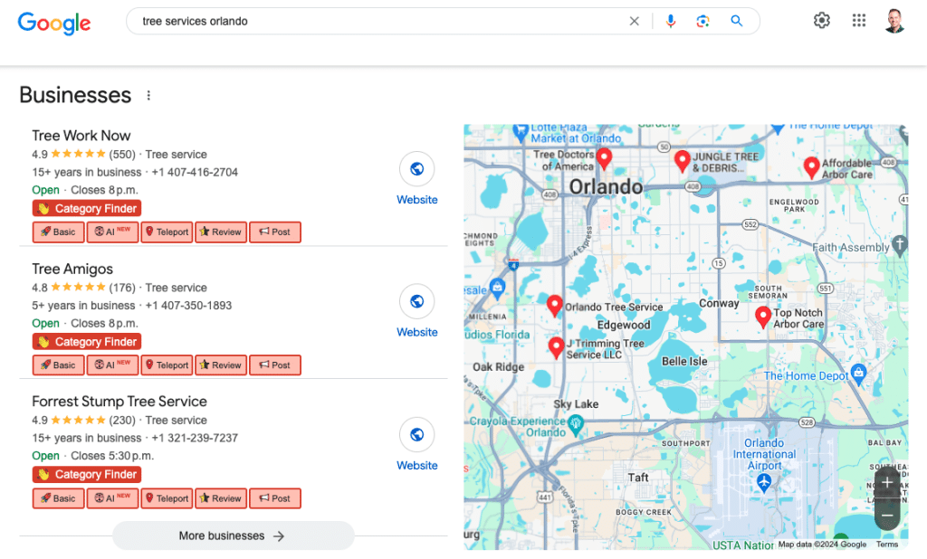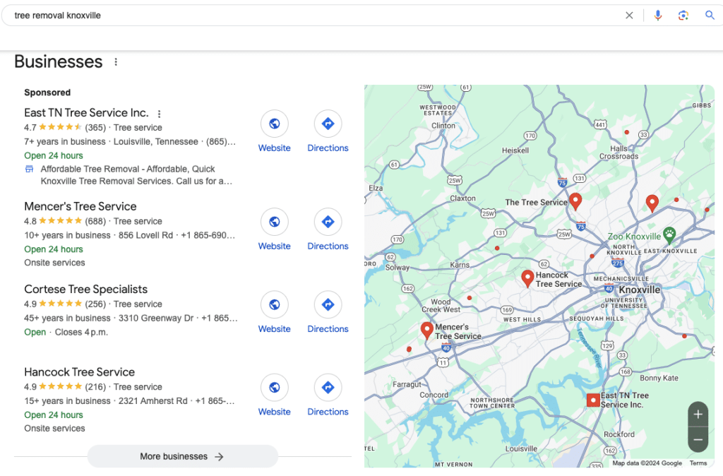 In order to show up in this list, your tree service business needs to have a verified and active Google Business Profile (GBP).