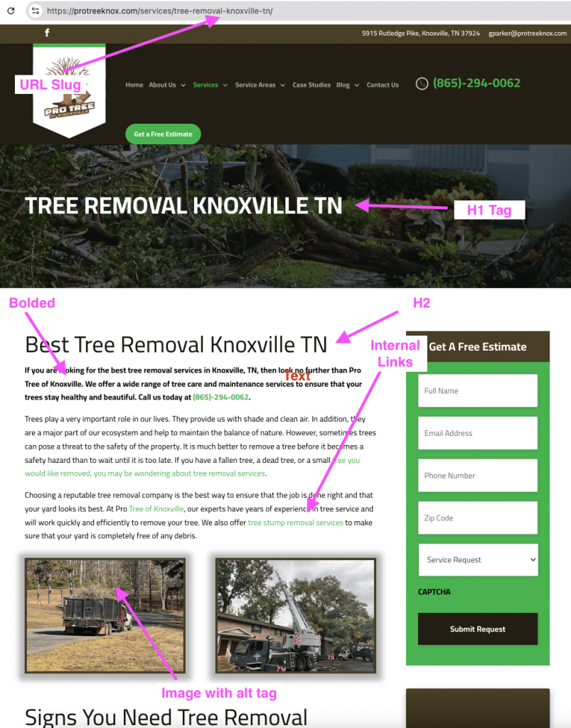 When I say “optimize” at the fundamental level I simply mean to include the keyword or variation within each of these areas of the page. I went ahead and took a screenshot of a top-performing tree service company in Knoxville, TN to use as an example: