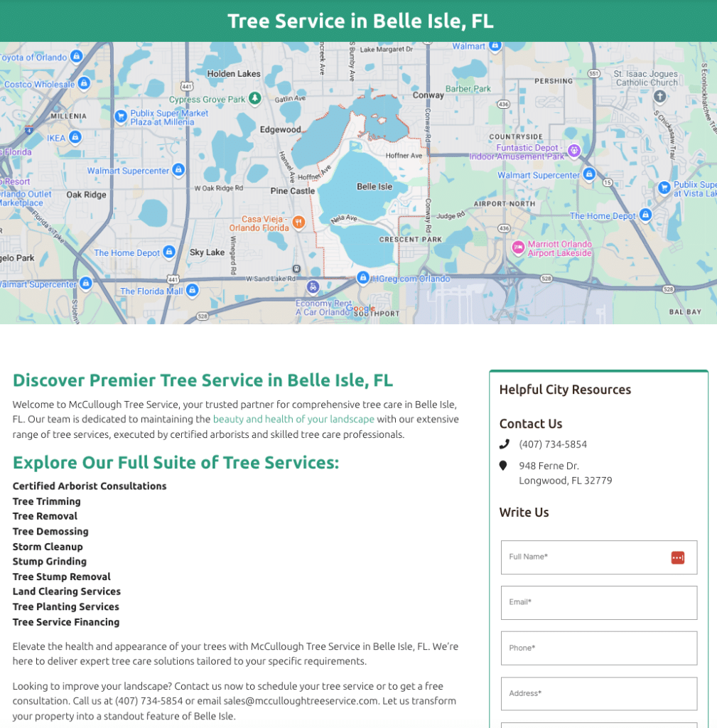 The homepage is usually the page for which you connect to your Google Business Profile. It’s possible that it targets the larger city or location in which you compete (tree services portland or, as an example). Because of this, you should make sure that it has enough supporting content to satisfy the needs of being a GBP landing page, including:
