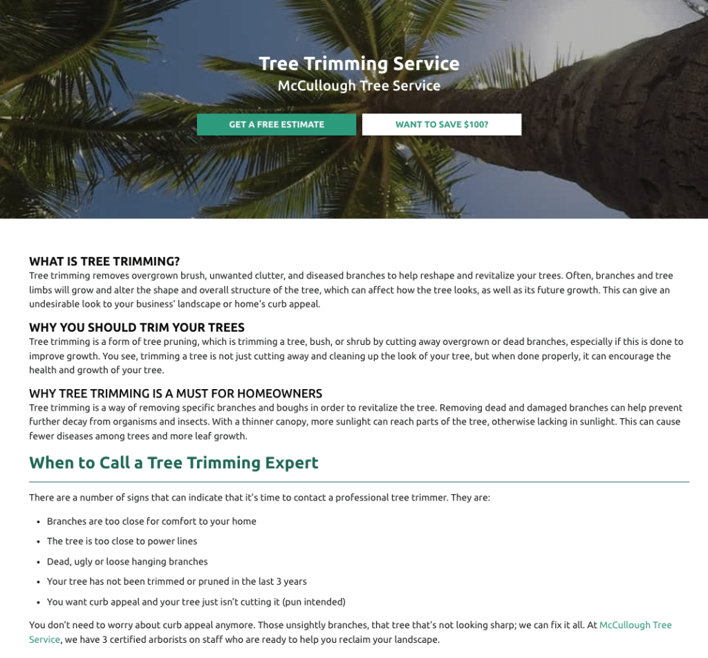 The page continues on, and there is about 1500 words of content. As you can see from the content itself, it is a mix of information – what is tree trimming and why you should trim trees, and brand-focused – about our tree services, what we do, how we help, etc.