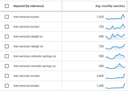 Now that we know what performing well means in terms of click-through rates, let’s see what sort of search volume opportunity exists. In the below image, I pull search volumes for mid-markets in the US (population of 500-600k). I use the main search terms including tree services and tree removal.
